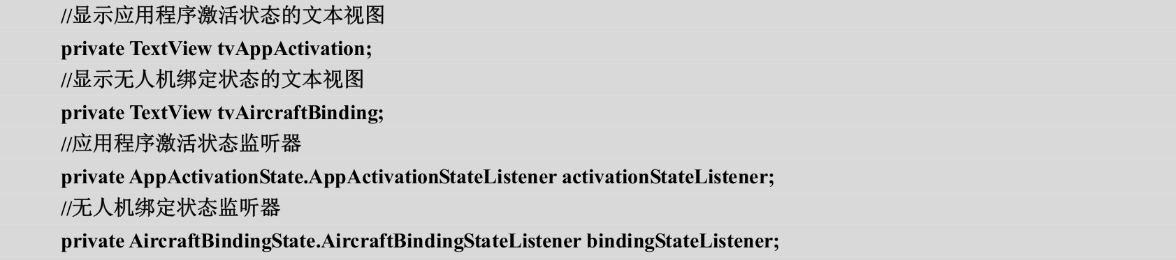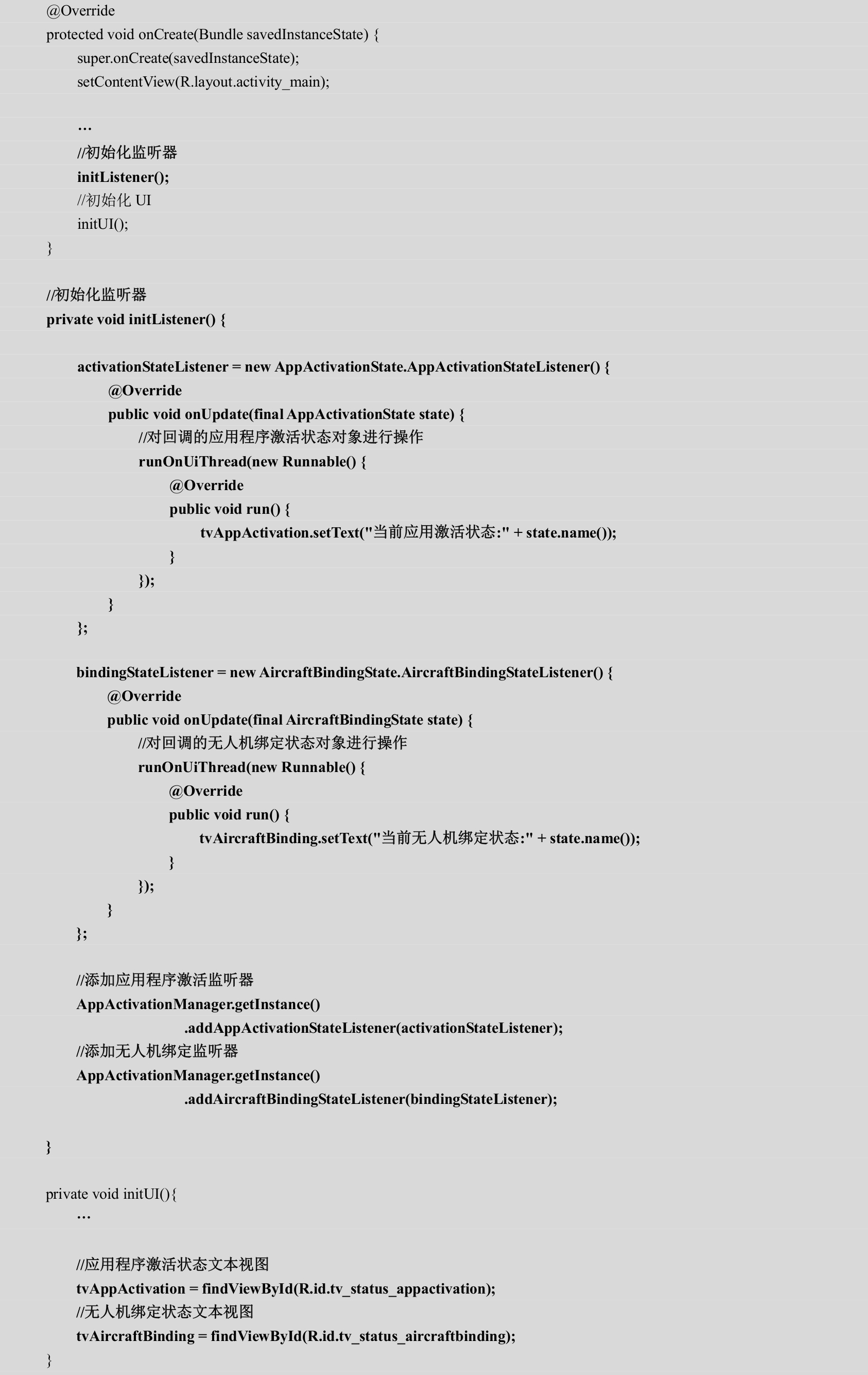 (2)在initUI()方法中初始化文本视图成员变量。在新创建的initListener()方法中初始化应用程序激活状态监听器和无人机绑定状态监听器,并且initListener()方法由onCreate(…)方法负责调用,如代码3-15所示。