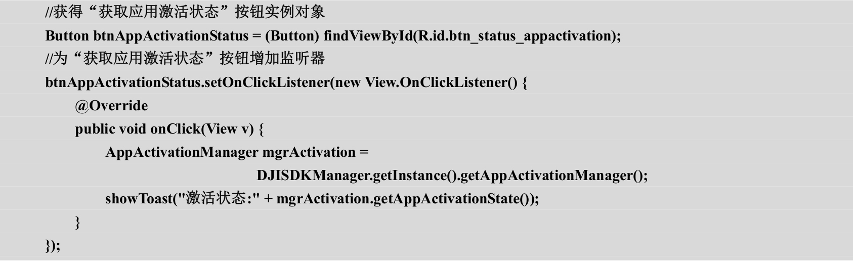 应用程序激活监听器和无人机绑定监听器都采用了onUpdate(…)方法,并且分别传递回来了AppActivationState对象和AircraftBindingState对象。为了将状态信息显示在相应的文本框中,上述代码通过runOnUiThread(…)方法跳转到UI线程对文本框进行更新。由于涉及线程跳转,在AppActivationState对象和AircraftBindingState对象前需要通过final关键词进行修饰。