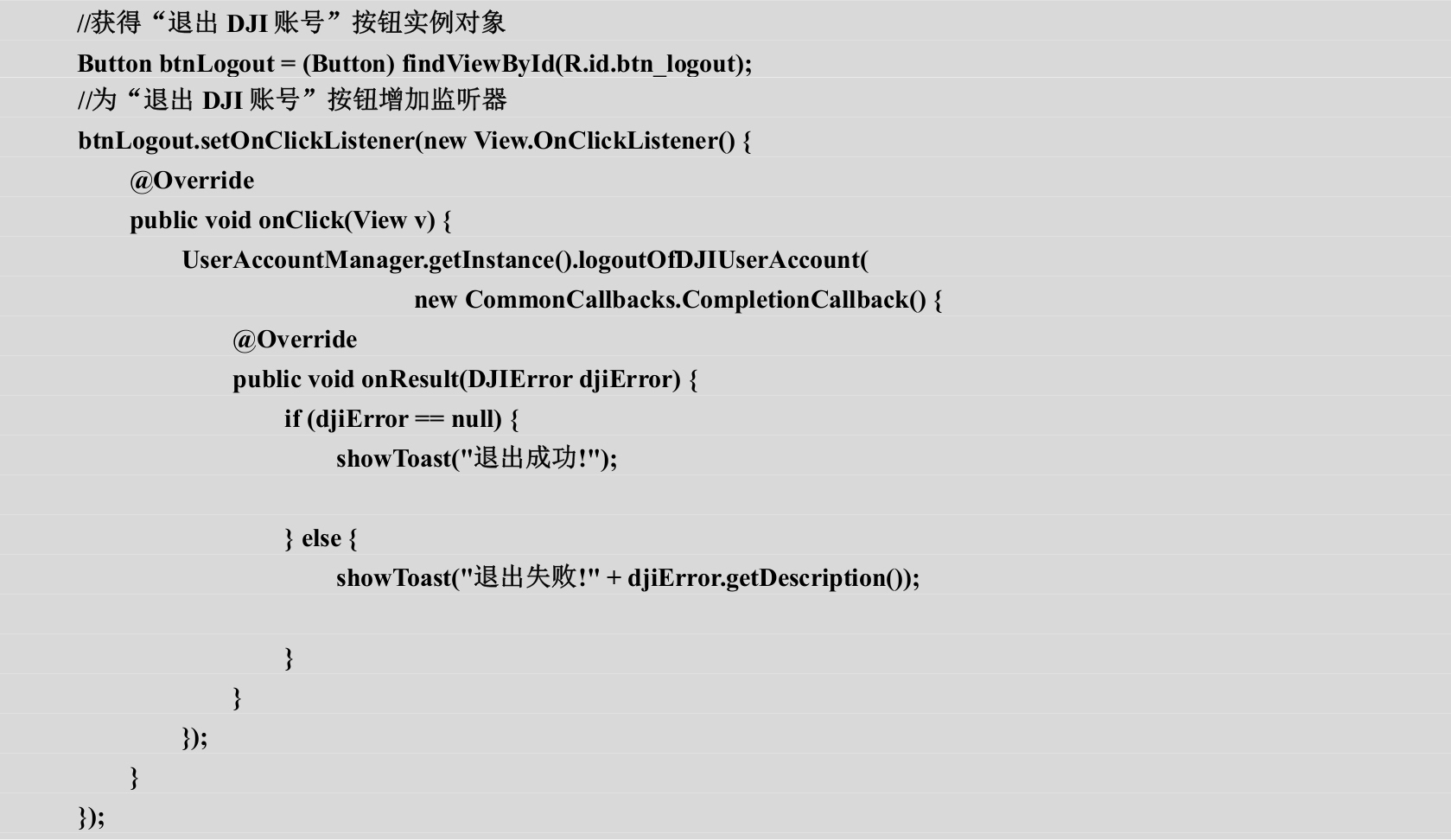 但是,与登录DJI账号不同的是,退出DJI账号方法的回调对象中只包括onResult(DJIError djiError)一个回调函数。当djiError参数为空时,说明退出成功;反之,则可通过djiError对象的getDescription()方法获取其错误的具体信息。