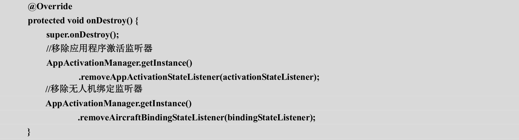 (3)复写MainActivity的OnDestory()生命周期方法,并移除应用程序激活监听器和无人机绑定监听器,以防止出现当MainActivity对象被回收后,应用程序激活管理器单例对象还保留着MainActivity中的监听器方法从而出现错误,如代码3-16所示。