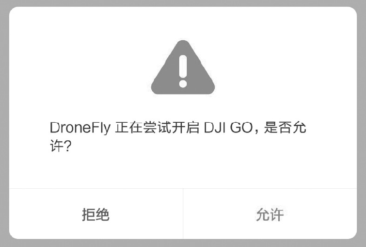 执行上述代码后,如果已安装DJI GO(或DJI GO 4)软件,则会通知用户自动跳转到DJI GO(Android)(见图3-14),否则会弹出相应的“未安装DJI Go 4?”提示。应用跳转失败如图3-15所示。