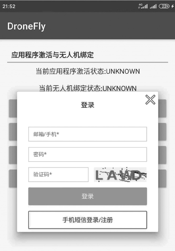 编译并运行程序,DJI账号登录界面如图3-13所示,连接无人机后,应用程序激活状态和无人机绑定状态如图3-16所示。