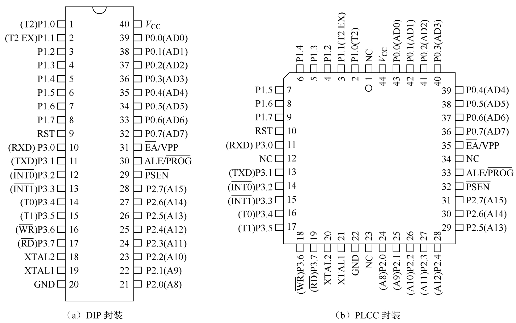 MCS-51单片机中的80C51和80C52常采用40Pin的DIP封装或者44Pin的PLCC封装,如图2-2所示。