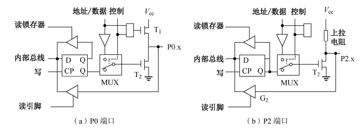 作为输入端口时,锁存器置1,Q(非)=0,T 2 截止,此时该位既可以把外部电路拉成低电平,也可由内部上拉电阻拉成高电平,因此P1端口称为准双向端口。作为输入端口使用时,有两种情况,一种是读锁存器的内容,进行处理后再写到锁存器中,这种操作是读→修改→写操作,如JBC(逻辑判断)、CPL(取反)、INC(递增)、DEC(递减)、ANL(与逻辑)和ORL(逻辑或)指令均属于这类操作。另一种是读P1端口状态时,打开三态门G 2 ,将外部状态读入CPU。