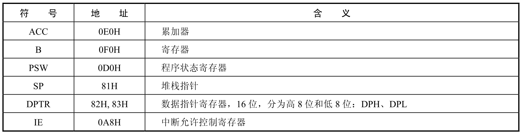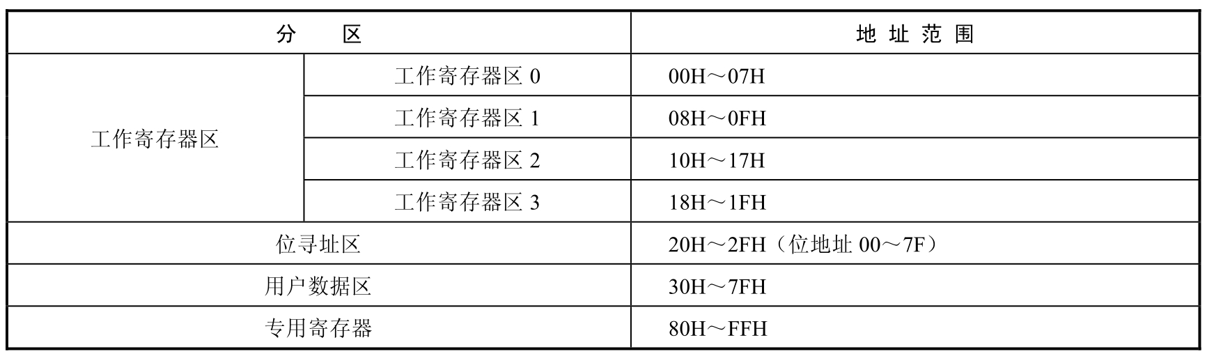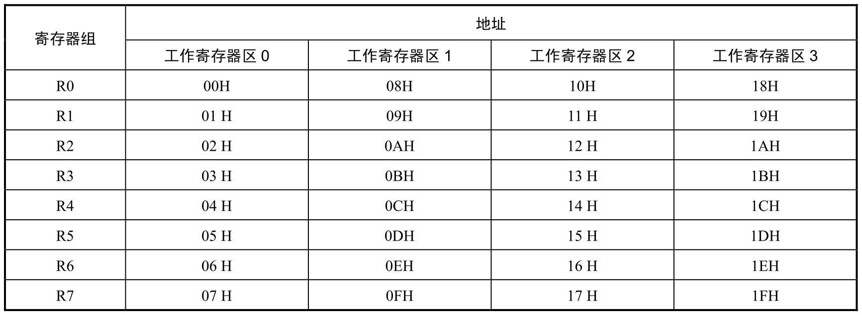 表2-5中,R0~R7寄存器组在汇编程序中可以通过设置RS1、RS0两个位,将寄存器分配到不同工作寄存器区,不同工作寄存器区的通用寄存器Rn(n=0~7)尽管编号n相同,但具有不同的RAM地址,因此通用寄存器共有8×4=32个。