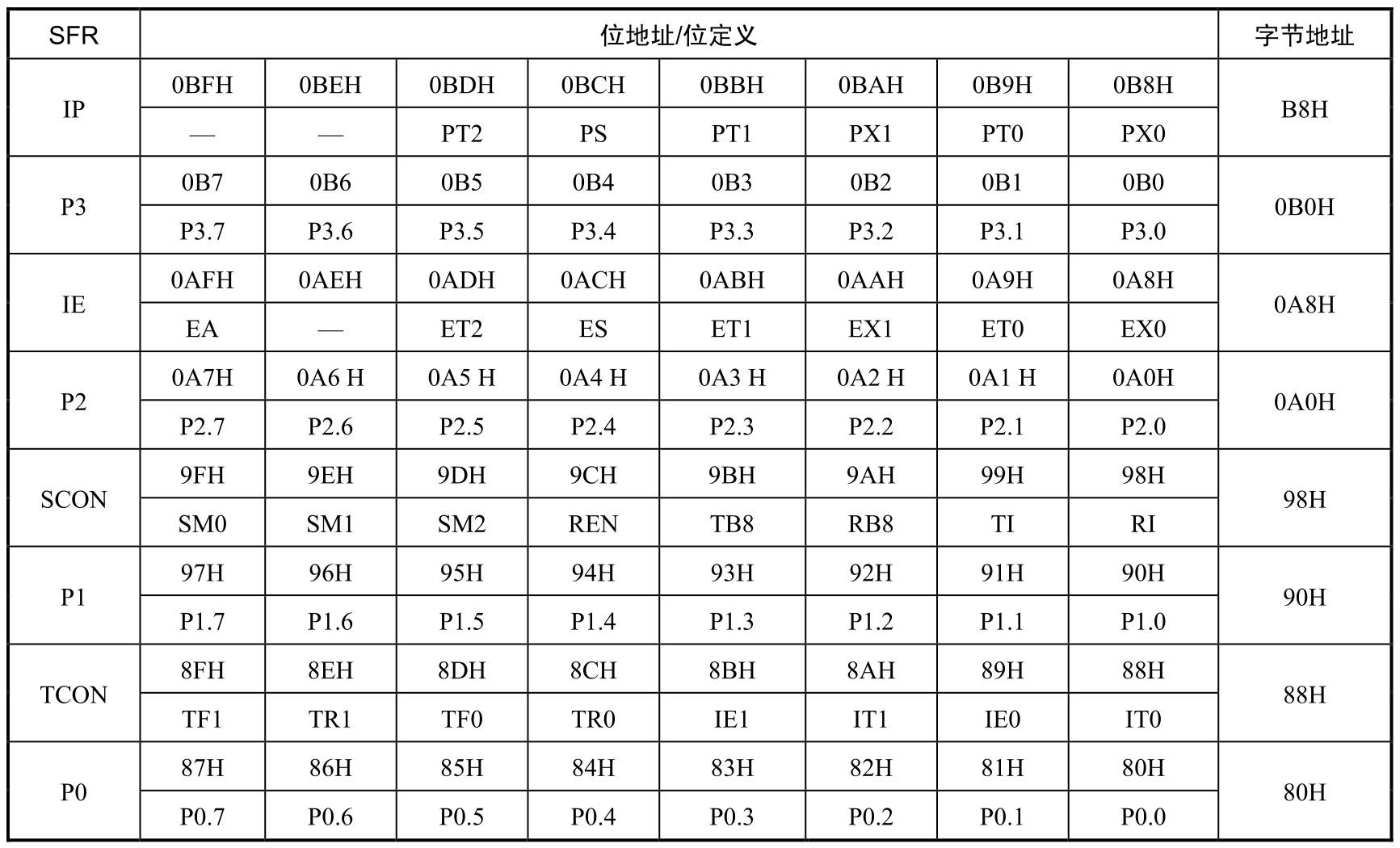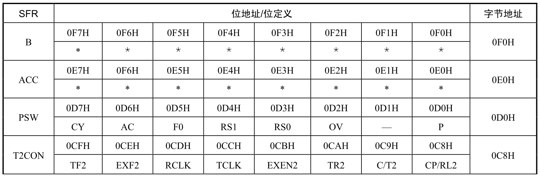 表2-8 8051和8052系列单片机中可进行位寻址的SFR的分布