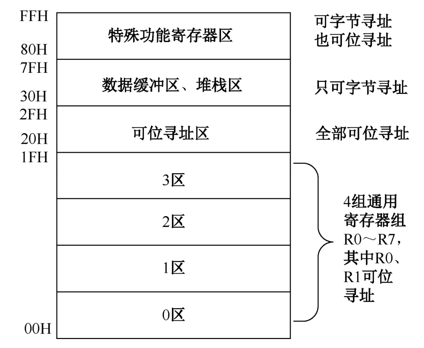 MCS-51单片机的内部数据存储器是最灵活的地址空间,由于集成在芯片内部,因此存取速度快、效率高,但数量少,常用于存放运算的中间结果、数据缓冲以及设置特征标志等。内部数据存储器在物理上分为两个不同的功能区,如图2-6所示。