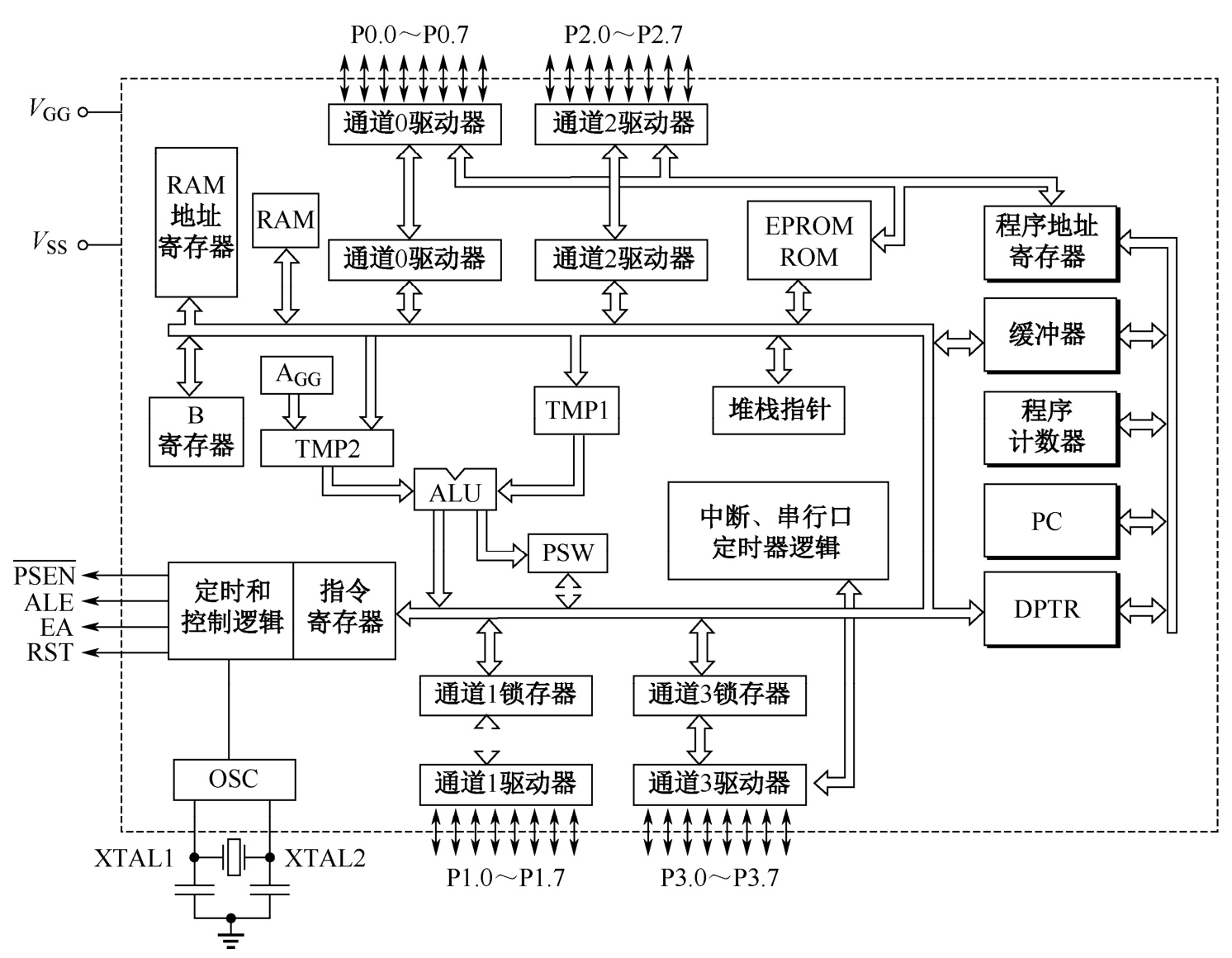 中央处理器(CPU):是整个单片机的核心,具有8位数据宽度,能处理8位二进制数据。CPU负责整个单片机的正常工作,完成算术运算、逻辑运算、输入/输出控制、中断处理等操作。