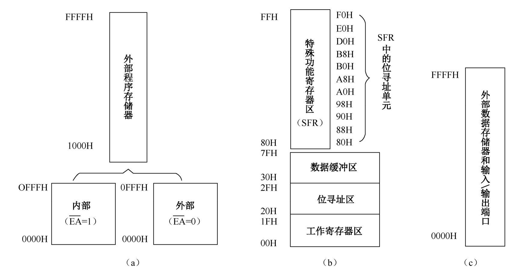 由图2-5可见,MCS-51单片机的存储器在物理上设有四个空间,即内部程序存储器、外部程序存储器、内部数据存储器和外部数据存储器。但由于内、外部程序存储器统一寻址,事实上只有3个逻辑空间,即内、外部统一寻址的64KB程序存储器地址空间、内部256B数据存储器地址空间和外部64KB的数据存储器地址空间,通过指令区分访问内部数据存储器还是外部数据存储器。在访问这3个逻辑空间时,应分别采用不同形式的指令,如MOVC(访问程序存储器)、MOV(访问内部数据存储器)和MOVX(访问外部数据存储器)等。内部数据存储器空间在物理上又包含两部分:对于51子系列单片机(如8031),从00H~7FH共128字节是真正的内部RAM空间,而80H~FFH仅其中20余字节用作特殊功能寄存器(SFR)空间,访问其他字节是无意义的;对于52子系列的单片机(如8032或8052),00H~7FH的含义与51子系列相同,而80H~FFH是内部数据存储器高端地址和特殊功能寄存器(SFR)端口地址的重叠区域。