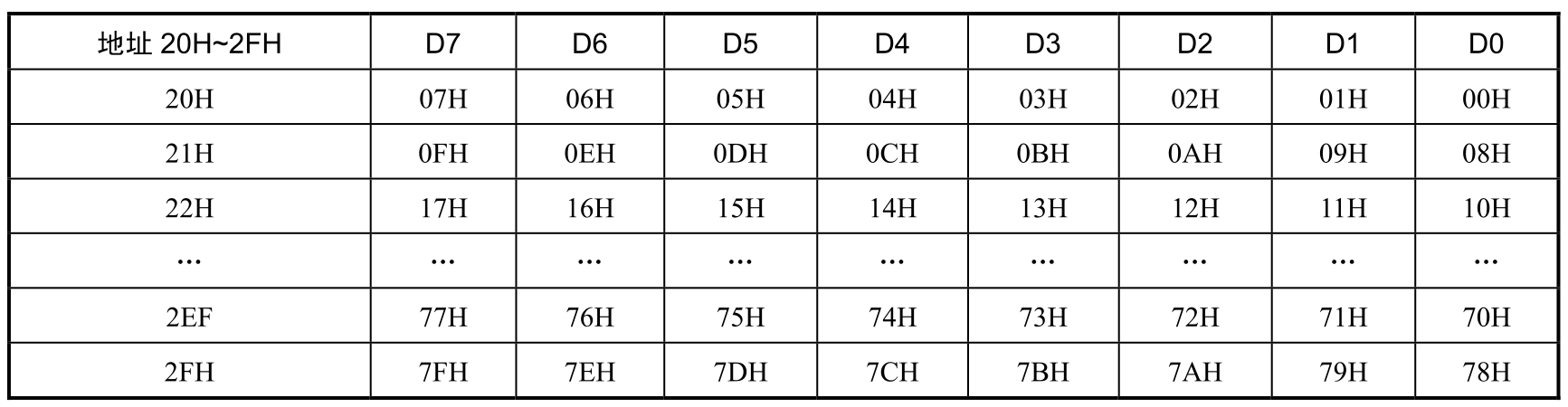 表2-6 内部RAM地址20H~2FH的位地址对应关系