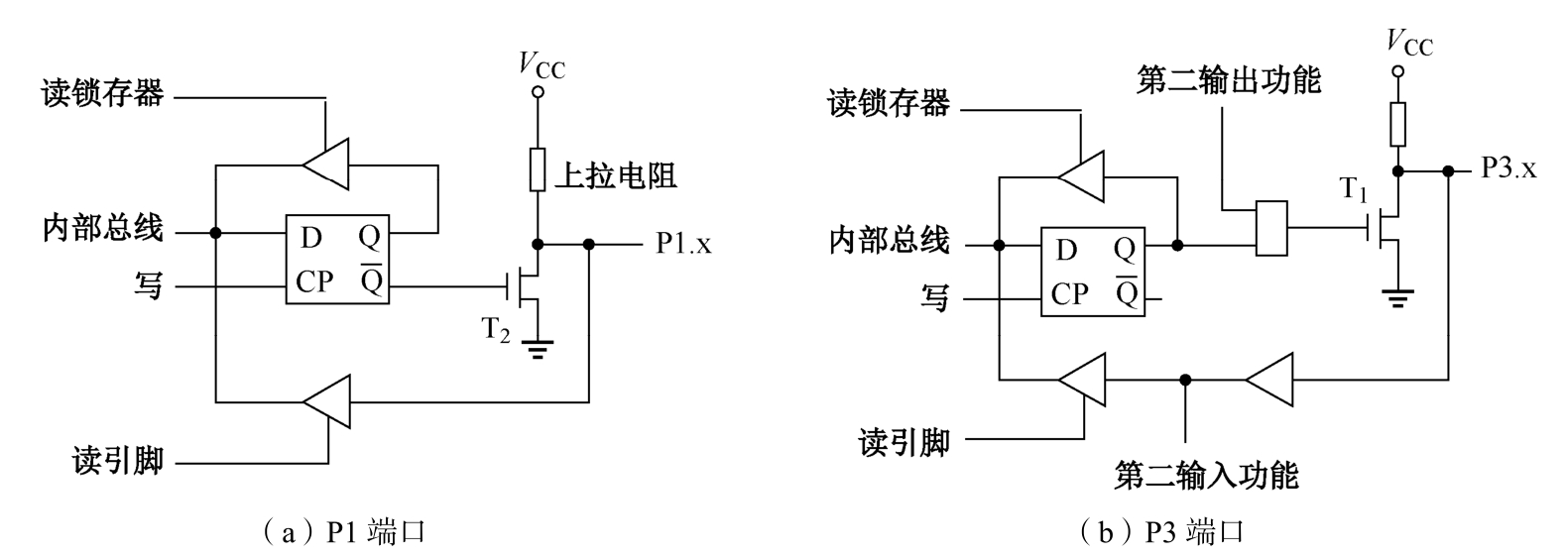 图2-4所示为P1和P3端口逻辑结构。P1端口为8位准双向端口,每一位均可单独定义为输入或输出端口。当作为输入端口时,1写入锁存器,Q(非)=0,T 2 截止,内上拉电阻将电位拉至“1”,此时该端口输出1;当0写入锁存器,Q(非)=1,T 2 导通,输出0。