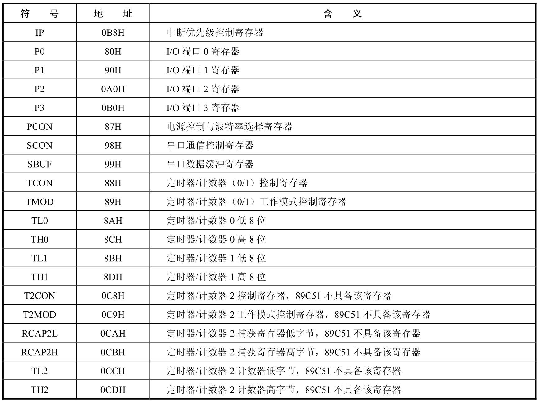 表2-7 8051和8052系列单片机主要特殊功能寄存器符号与含义
