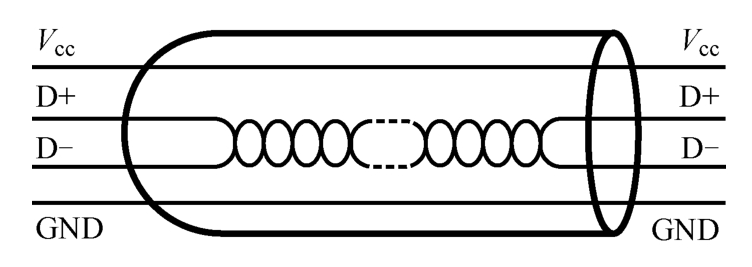 USB通过4线电缆传输数据和供电,其中D+和D-是差模信号线, V cc 为+5V电源,GND为电源地,如图1-3所示。
