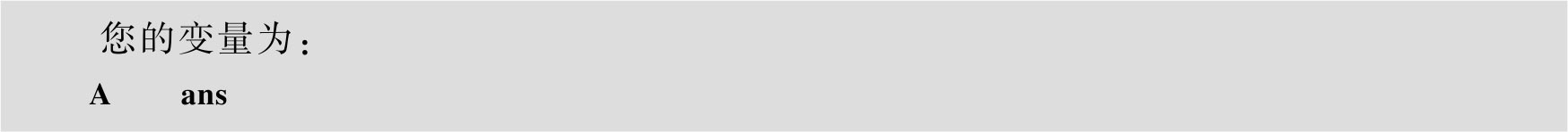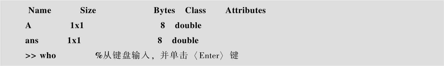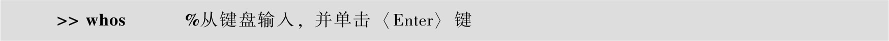 在命令行窗口中,输入 “whos” 命令,可以显示保存在工作区的所有变量的名称、大小、数据类型等信息;输入 “who” 命令则只显示变量的名称。输入 “clear” 命令,可以清除工作区内所有变量,并释放系统内存空间;输入 “clc” 命令则只清除命令行窗口的屏幕显示内容,而保留工作区内容。