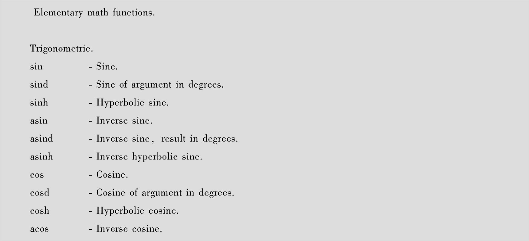 (2)显示某类函数信息。在 “help” 函数后,输入某类函数的名称(需要知道某类函数的名称或在 “帮助” 文档中检索)。例如在命令行窗口输入如下函数: