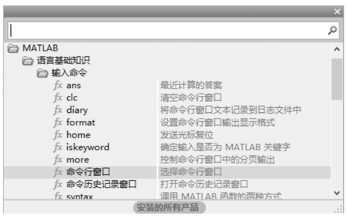 在命令行窗口内单击鼠标,使光标停留在命令行窗口,再单击按键 〈Shift+F1〉,MAT-LAB将打开函数浏览器窗口,如图1-3所示。