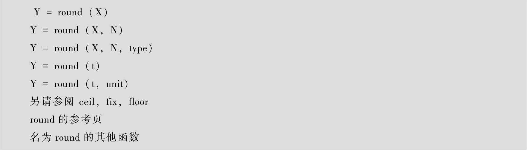 此MATLAB函数将X的每个元素四舍五入为最近的整数。在对等情况下,即有元素的小数部分恰为0.5时,round函数会偏离零四舍五入到具有更大幅值的整数。