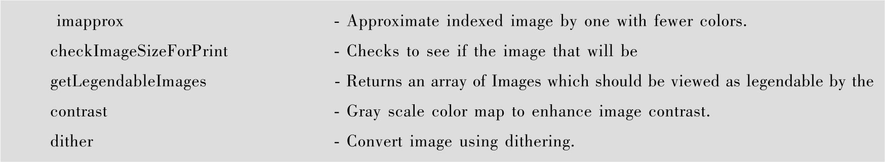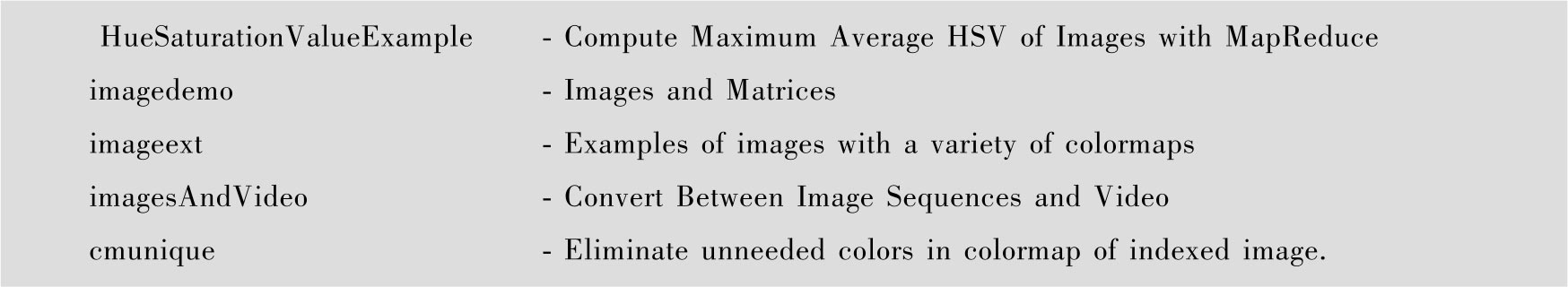 当用户希望查找具有某种功能的命令或函数,但又不知道准确名字的时候,可以使用“lookfor” 函数。该函数可以根据用户提供的完整或不完整的关键词,搜索出一组与之相关的函数。例如查找有关图像的函数,将image作为关键词来查找,具体如下: