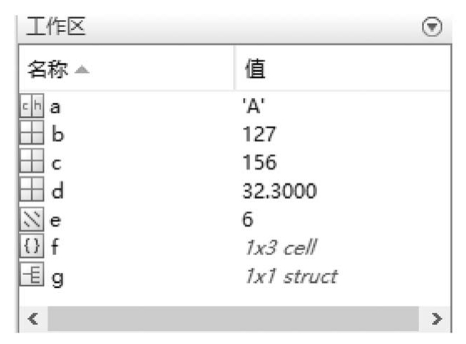 表1-1中的数据例子可以在命令行窗口直接输入。MATLAB的数据类型还有一些其他的表达形式,表中没有列出。在工作区浏览器中,不同的数据类型有着不同的图标标识,在工作区中显示的数据类型如图1-4所示。