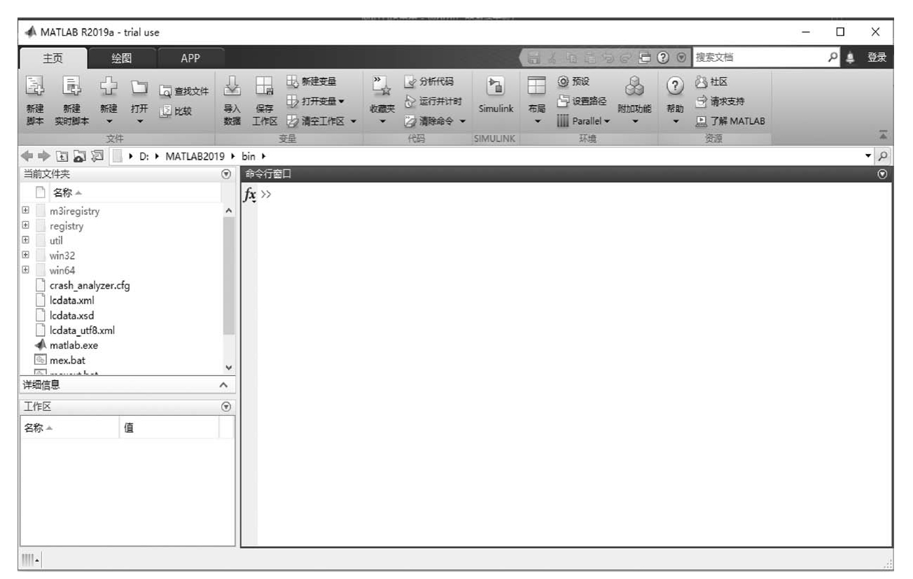 MATLAB软件安装完成后,可通过创建的桌面快捷方式;也可以到 “开始” 菜单里查找安装的软件;还可以到软件的安装目录里,打开bin文件夹,单击其中的matlab.exe文件,都可启动 MATLAB 软件,启动后MATLAB操作界面如图1-1所示。