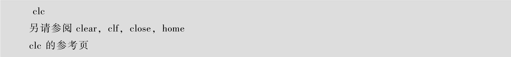此MATLAB函数清除命令行窗口中的所有文本,让屏幕变得干净。运行clc后,用户不能使用命令行窗口中的滚动条查看以前显示的文本,但可以在命令行窗口中使用向上箭头键〈↑〉 从命令历史记录中重新调用语句。