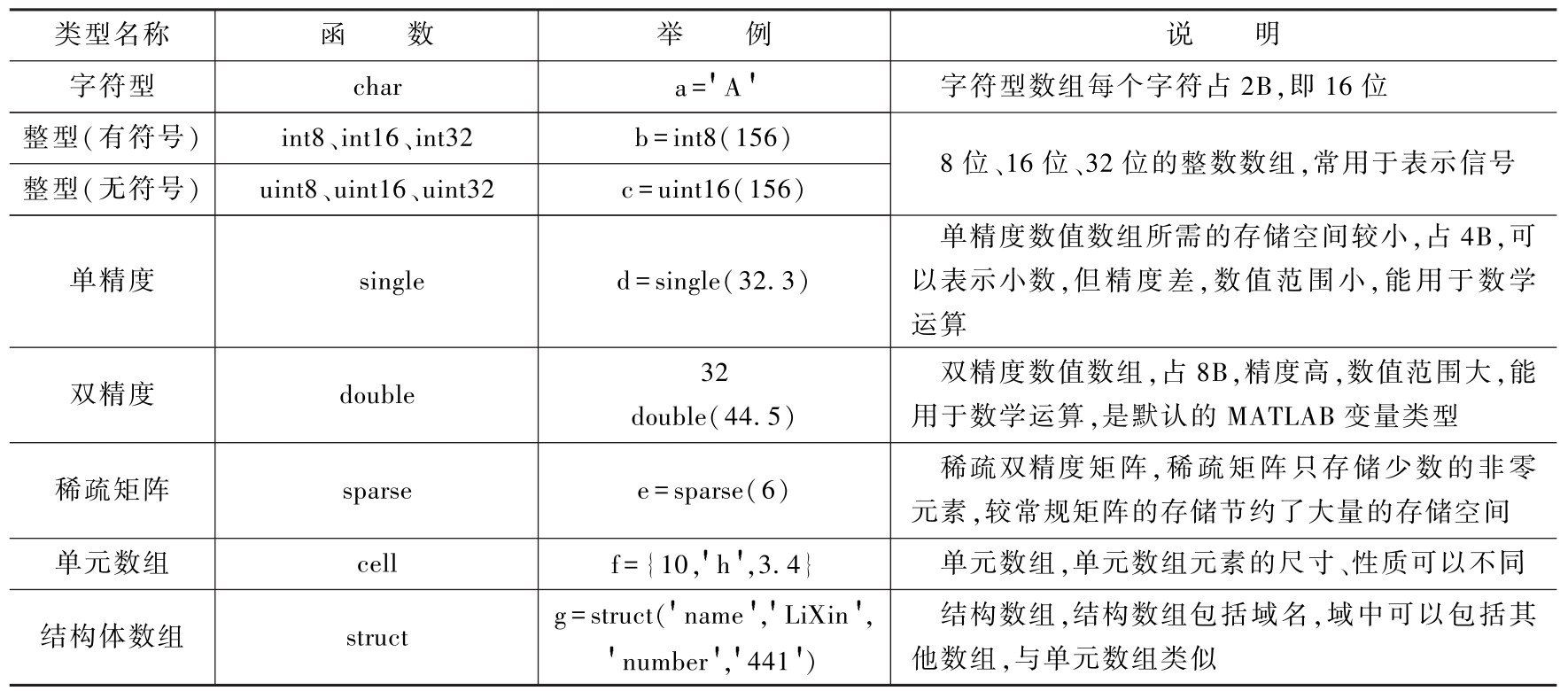 对于数值数据,MATLAB中最常用的类型为双精度型,占64 位(8B),用 double 函数实现转换。此外还有单精度数,占32位(4B),用single函数实现转换。还有带符号整数和无符号整数,其转换函数有int8、int16、int32、uint8、uint16和uint32,每一个函数名后面的数字表示相应数据类型所占位数,其含义不难理解。
