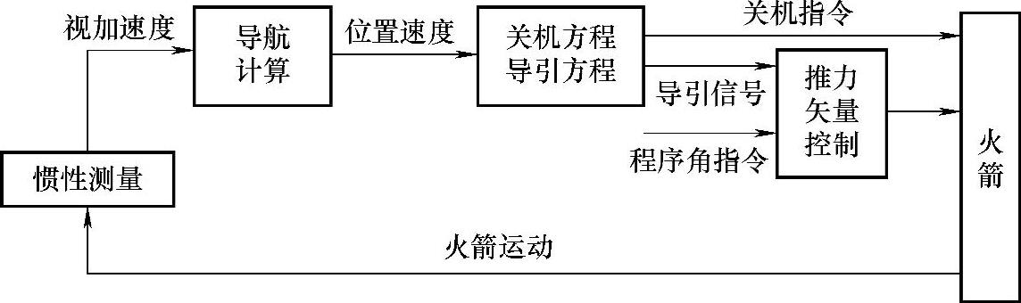 制导系统根据实测的火箭运动参数进行导航计算,实时获得火箭的实际位置和速度值,同时根据火箭的当前状态(位置和速度)和其控制的终端状态,实时给出使火箭能达到终端状态的某种姿态控制指令,即对火箭按一定规律进行导引并不断计算关机方程,当满足关机条件时立即发出关机指令,对发动机实施关机。图1.2-1给出了制导系统功能框图,这就是说,火箭在动力飞行段应具有以下功能: