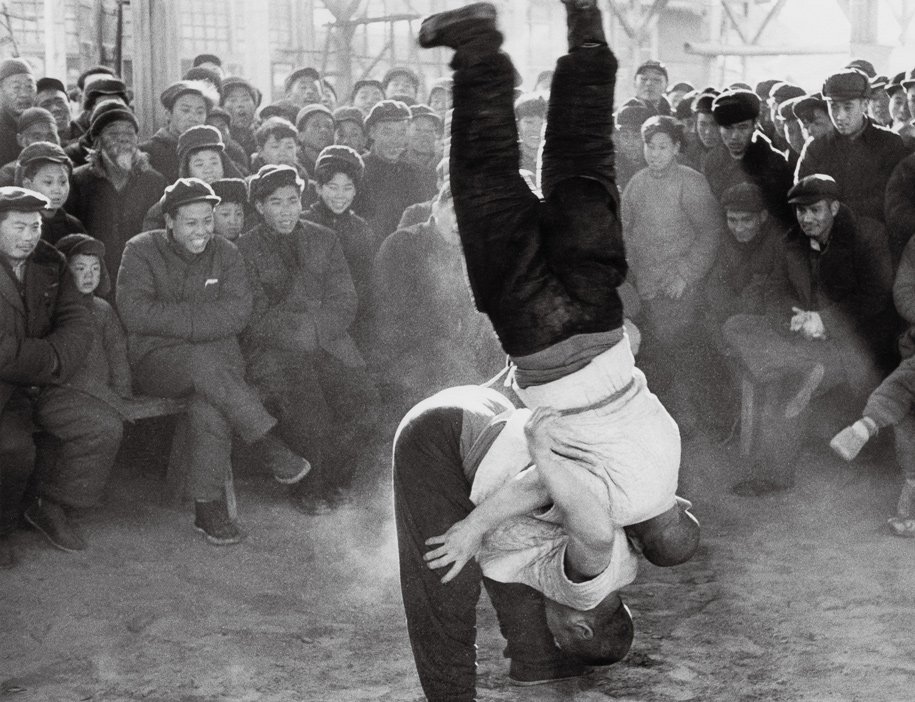 1957年,北京天桥,两名摔跤手表演摔跤。摔跤手将对手过肩摔倒的那一瞬间被马克·吕布用相机记录了下来。一个人被倒立在空中马上就要摔在地上,与背景里兴奋的观众,一同构建了一个紧张的视觉高潮。