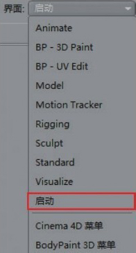 如果想回到预设的布局界面,那么可以单击软件界面右上角的“界面”下拉列表,选择“启动”选项,即可恢复默认布局,如图1-17所示。“界面”下拉列表中预置了多种模式的布局,适用不同功能,读者可以自由选择并切换。本书使用默认布局。