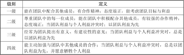 为明确管理,胜任力模型各维度下的每项特质要分成不同的等级,并配备详细的文字描述。比如,素质维度下团队精神的特质,通常是指在团队目标下,对团队利益和协作的共同认知,将其分级后如表1-3所示。