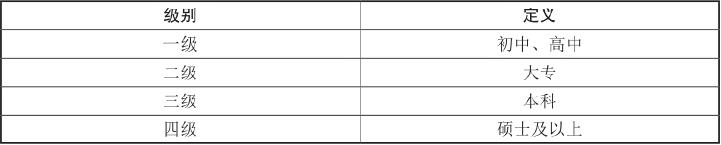 素质维度下的教育背景,按学历可以分为初中、高中(包括中专和中等技术学校)、大专、本科、硕士及以上。企业可以将教育背景划分为4级,如表1-4所示。