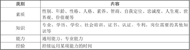 人才选拔的四大维度分别是素质、知识、能力、经验,如表1-2所示。