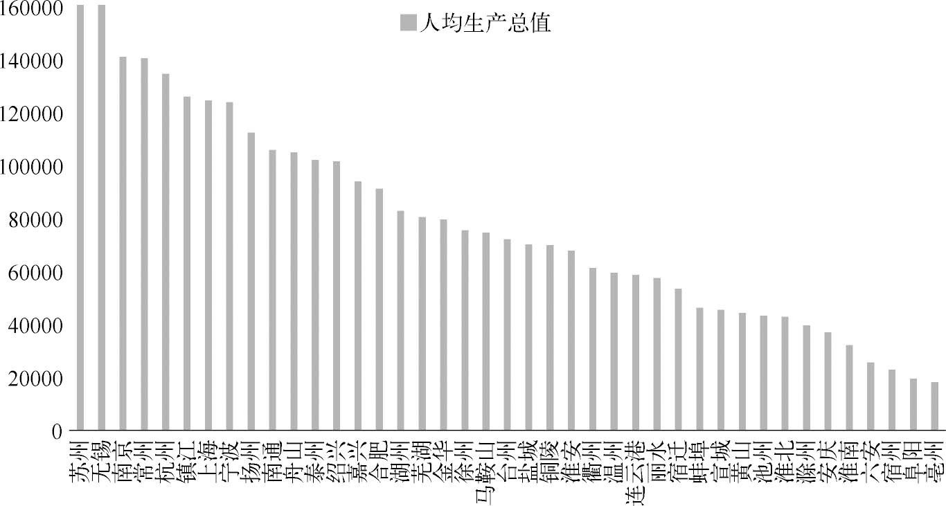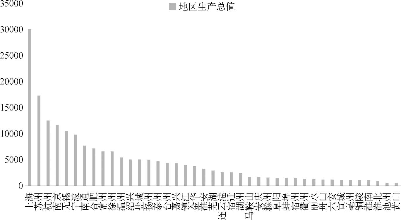 从具体排列看,大致可以分成以下几个层次。第一层次是1.5万亿以上,有上海、苏州2个城市。第二层次是1万亿~1.5万亿,有杭州、南京、无锡3个城市。第三层次是0.5万亿~1万亿元,有宁波、南通、合肥等9个城市。第四层次是0.1万亿~0.5万亿元,有泰州、台州、嘉兴等24座城市。第五层次是0.1万亿元以下,有淮北、池州和黄山3座城市。各城市在地区生产总值的数量之间形成非常大的反差,如城市地区生产总值最高的上海与最低的黄山之间相差将近50倍。