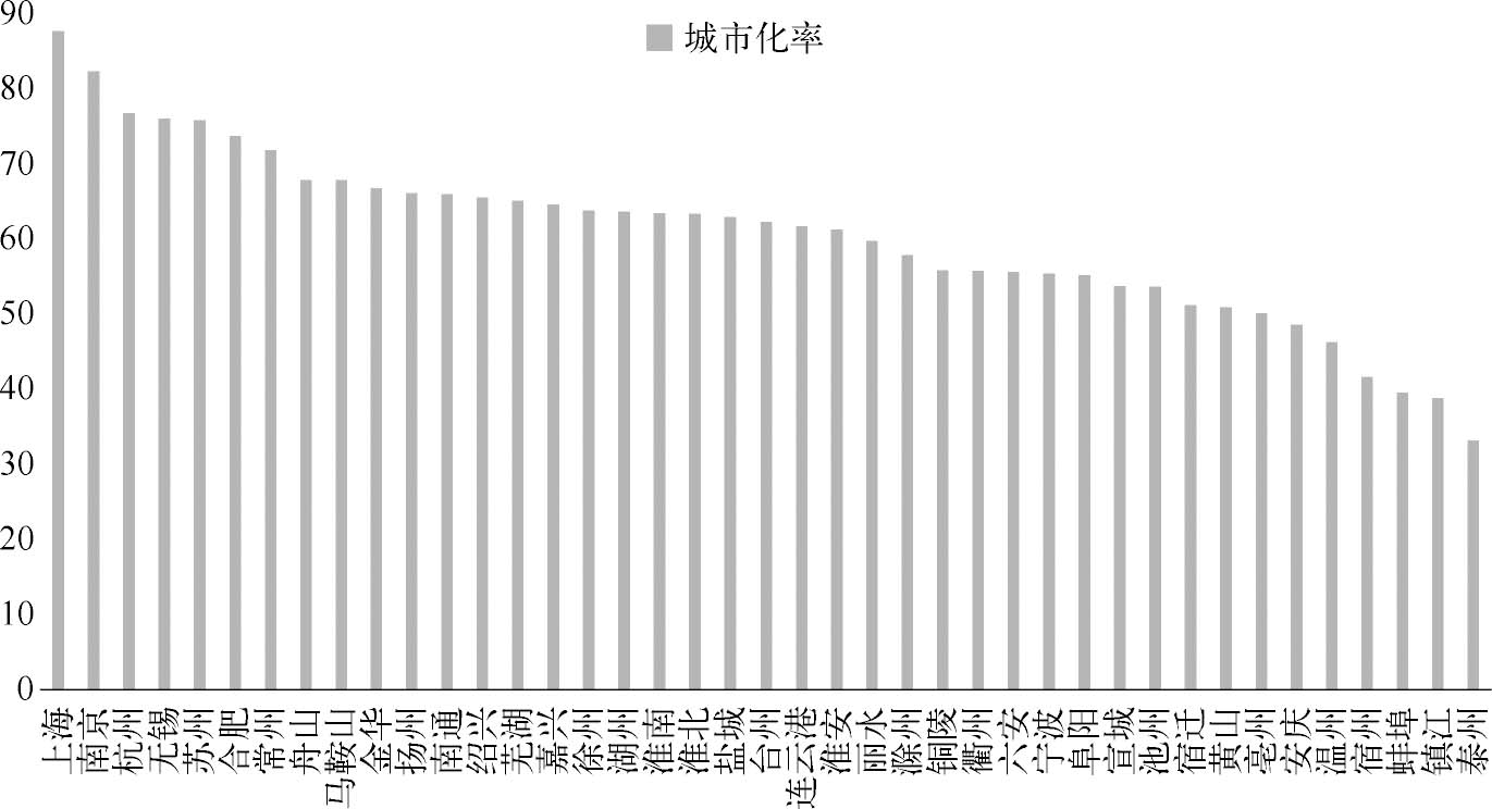 城市化水平在一定意义上反映了城市规模不断扩大的过程,涵盖了经济规模、人口规模和用地规模三个方面。自改革开放以来,我国城市化水平的发展已取得长足进步。在2017年,长三角41座地级以上城市的城市化水平的均值为59%,其中城市化水平达到70%以上的除上海和三省的省会城市(杭州、南京、合肥)外,还有无锡、苏州和常州,共7座城市。见图4-3。
