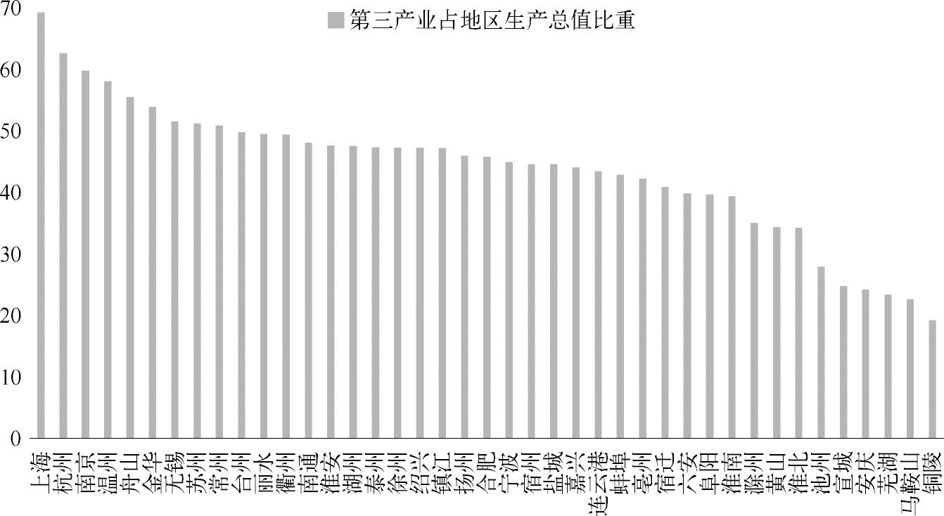 图4-4 长三角41个城市第三产业占地区生产总值比重一览图 单位:%