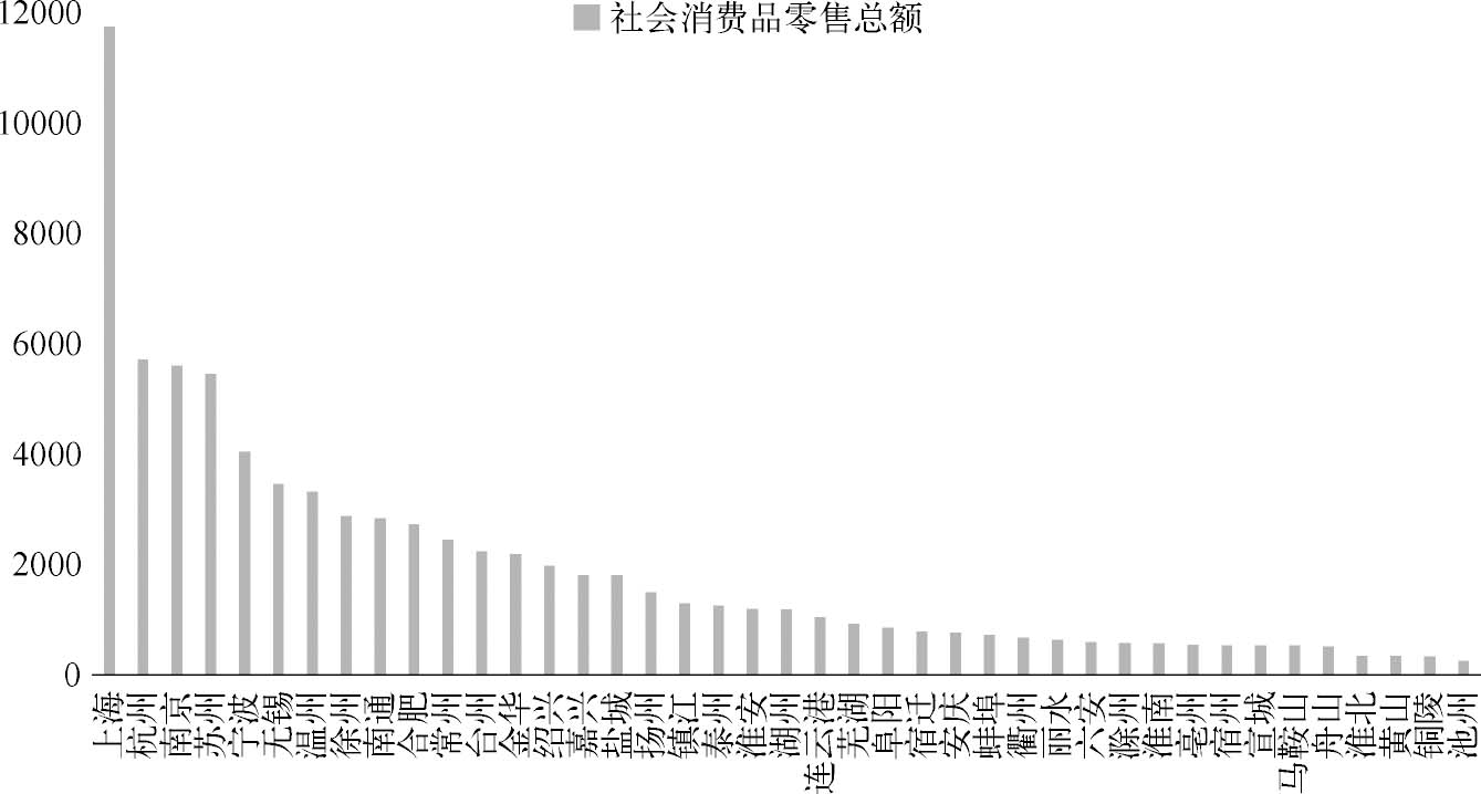 图4-6反映了上海市在居民生活水平、商品购买力和市场规模等方面在国内城市中具有无可比拟的综合优势。从整体上看,大多数城市社会消费品零售总额在6 000亿以下,不及上海的一半,表明除上海外长三角地级市的社会消费品零售业态还处于较弱的发展状态。此外,浙江、江苏的各地级市整体排名较为靠前,而安徽的各地级市整体排名比较靠后,如排名后四位的淮北、黄山、铜陵、池州均为安徽的城市,说明浙江、江苏在这方面与上海的差距十分明显,同时安徽与浙江、江苏的差距亦十分明显。