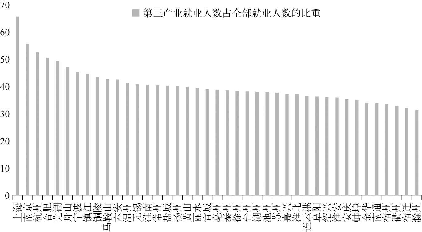 第三产业就业人数占全部就业人数的比重,通常反映了第三产业结构调整的进程和服务经济质量的高低。发达国家第三产业的就业人数占全部就业人数的比重一般都在60%~70%左右,是吸引就业人数最多的产业部门。现阶段,我国第三产业发展相对落后,第三产业就业比重自然较低,而且各城市差异颇大。由于第三产业以服务部门为主,就业人数比重在一定程度上反映了城市休闲产业发展的状况。我国长三角地区各地级以上城市第三产业就业人数占全部就业人数的比重统计见图4-5。其中,上海、南京、杭州、合肥和芜湖排名前5位。