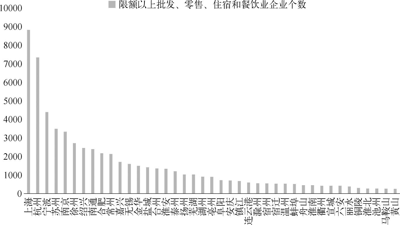 各城市限额以上批发、零售、住宿和餐饮业企业个数统计见图4-9。其中上海、杭州、宁波、苏州和南京名列前5位。