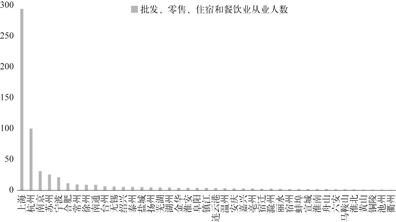 从数据分析看,各地级市发展非常不平衡。首先,上海在批发、零售、住宿和餐饮业方面的就业人数最高,这与上海服务产业发达,市场规模庞大,居民人口众多以及外来游客流量巨大等直接相关。其次,从层次看,上海就业人数在200万以上,为第一层次,占总数的48.14%。杭州就业人数在100万以上,为第二层次,占总数的16.37%。南京、苏州、宁波、合肥4座城市就业人数在10万~100万之间,为第三层次,占总数的14.63%。常州、徐州等35座城市就业人数在10万以下,为第四层次,占总数的20.86%。最后,最后,从差异看,排名首位的上海约为294.82万,位列末尾的衢州约为0.71万,两者之间相差高达414倍,表明不同规模的城市之间存在悬殊差异。