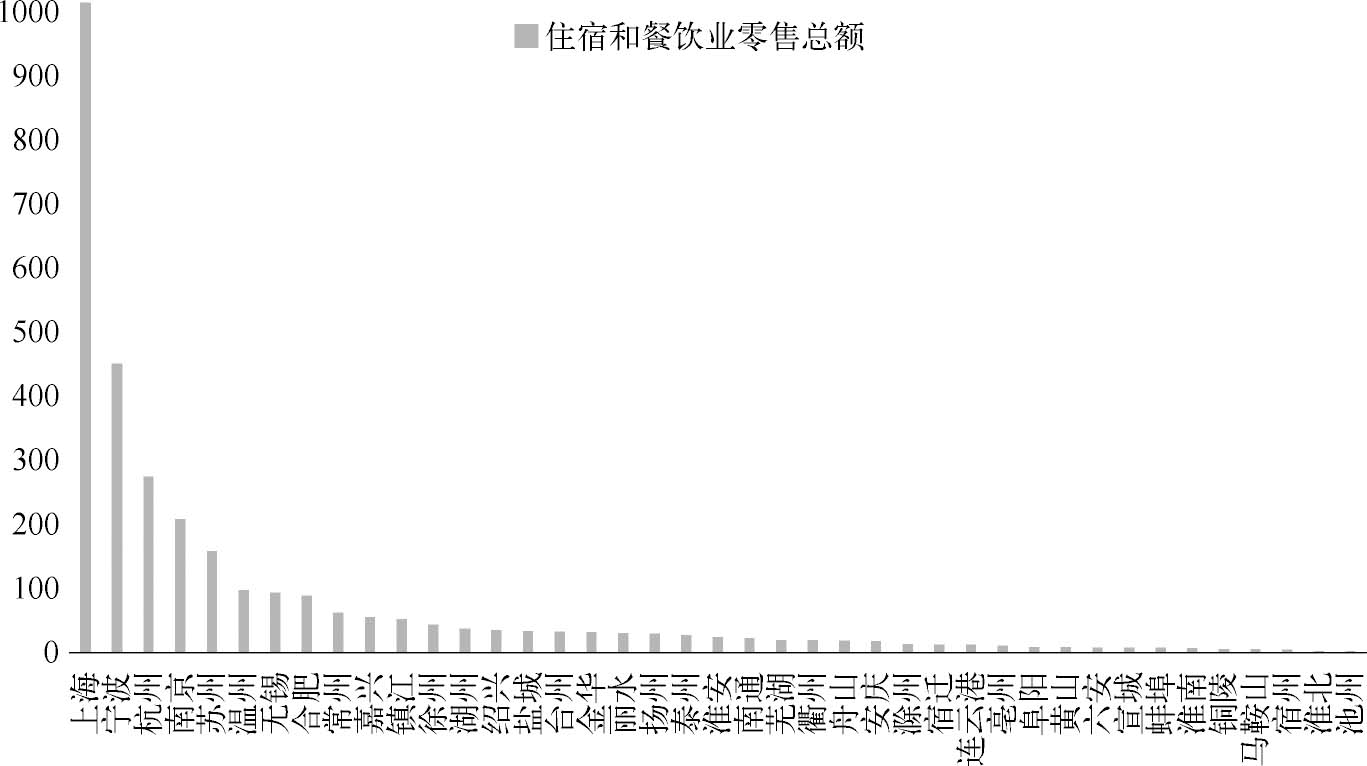 城市住宿和餐饮业零售总额是社会消费品零售总额进行分类的一个统计。从居民日常休闲活动与游客各种形式的旅游活动看,或多或少都与住宿和餐饮服务业产生直接关系,所以从住宿和餐饮业零售总额入手,有助于进一步了解居民和游客在住宿与餐饮方面消费的状况。各城市统计数据见图4-7。其中上海、宁波、杭州、南京、苏州名列前5名。
