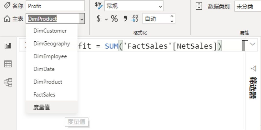 选中Profit度量,在主表中选择“度量值”命令。度量被移动到新的表中,如图2.4.28所示。