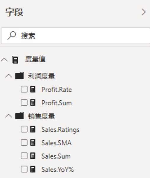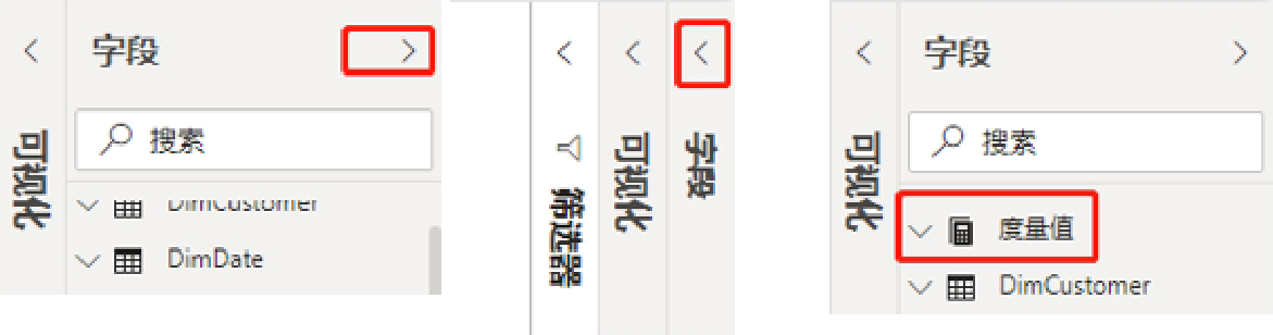 参照图2.4.30所示的步骤将字段栏打开,发现度量值文件夹的图标发生了变化,因为这里面只存放度量。