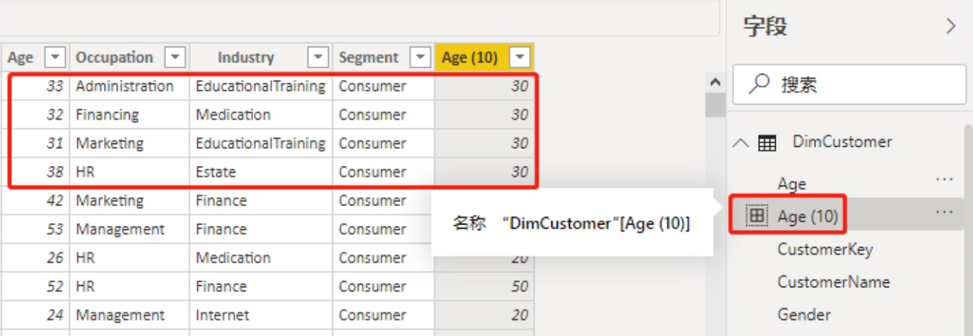 图2.4.36为新建的客户年龄组,如30、40、50。字段旁有装箱图标。
