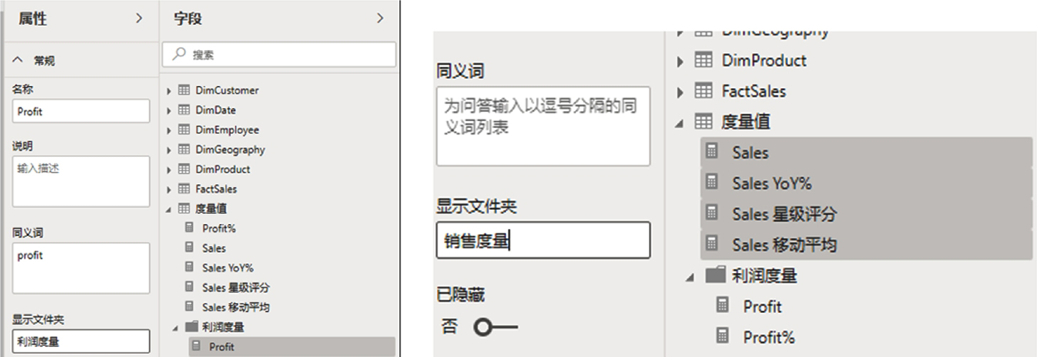 在度量值文件夹中提供了统一的存放路径,对于复杂的模型,可能有成百上千的度量。我们可以进一步创建子文件夹。在模型视图下,选中“Profit”度量,在属性栏中的“显示文件夹”中输入“利润度量”,见图2.4.31左图。用户可在按Shift键的同时选择多个度量,然后一次性命名子文件夹,见图2.4.31右图。