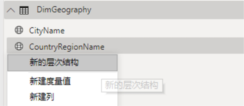 在数据分析中,各种数据经常会存在依存关系。参照图2.4.40,右击CountryRegion Name字段,在弹出的下拉菜单中选择“新的层次结构”命令。依次右击其余字段,在弹出的下拉菜单选择“添加到层级结构”命令中对应的层级,完成层级结构的创建。双击层级结构名称,可为字段重命名。
