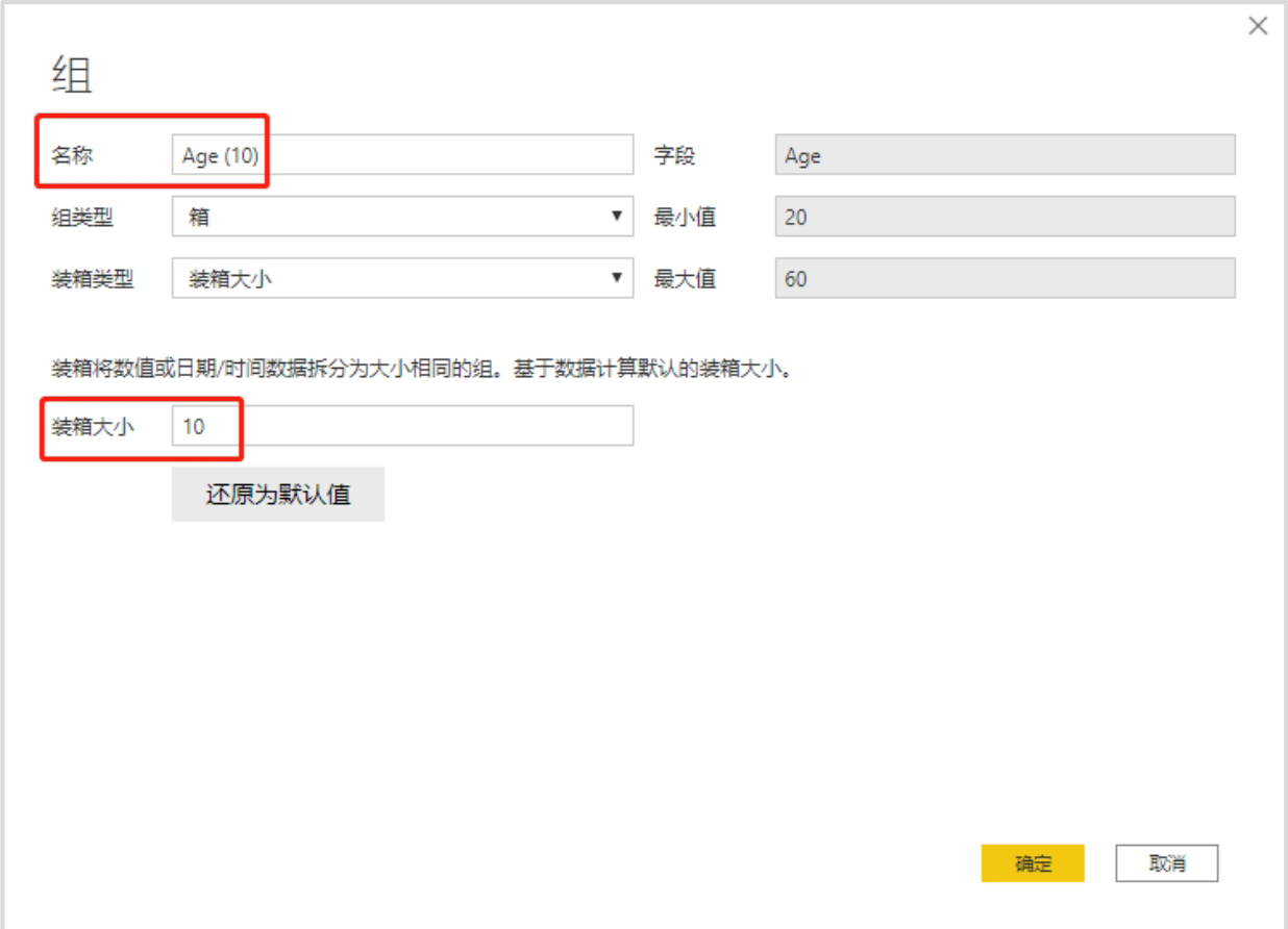在弹出的对话框中,可见字段的最小值和最大值分别为20和60,组类型为“箱”。参照图2.4.35,对组进行命名,将装箱大小调整为“10”,单击“确定”按钮。