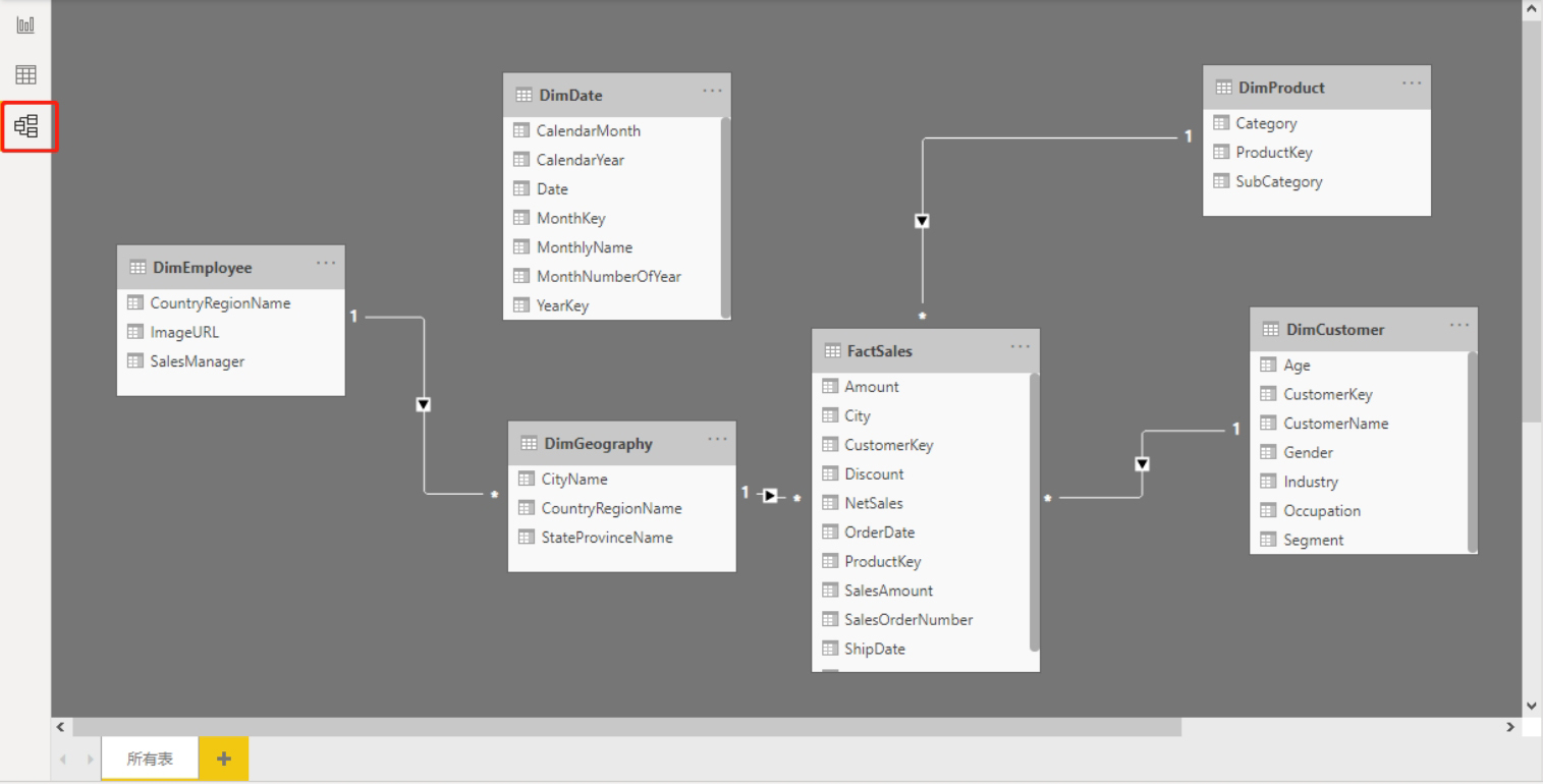 添加完成后图中出现了FactSales表与DimEmploys表,相当于显示了整体关系图的局部视图,如图2.4.4所示。在复杂的模型中,局部视图为用户提供了便利。