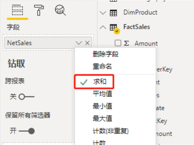 请留意“NetSales”字段旁的“Σ”图标,其代表该字段可被聚合。单击字段对应的下拉菜单,可见Power BI提供了多种聚合方式,如求和、平均值、最大值、最小值等,如图2.4.10所示。