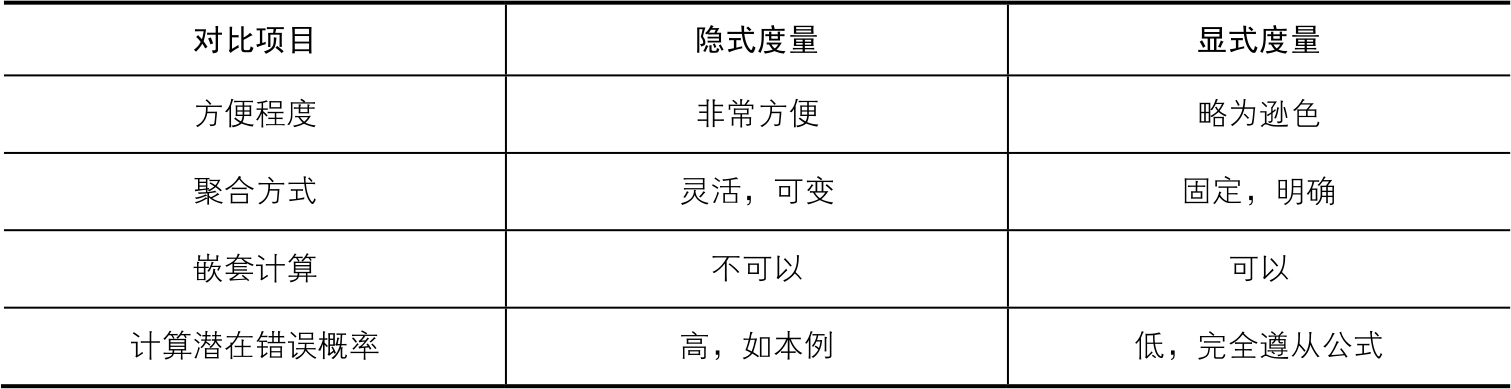 在通常情况下,建议用户优先使用显式度量,尤其对于涉及两个或以上变量的计算,以避免以上例子中不必要的错误。表2.4.1为隐式度量与显式度量的对比。