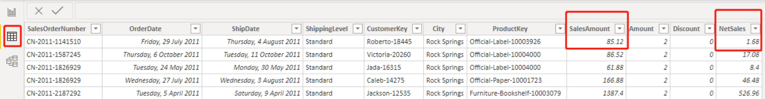首先在数据视图下观察销售表,见图2.4.8。SalesAmount字段代表销售额、NetSales字段代表利润,利润值即为NetSales的总和。